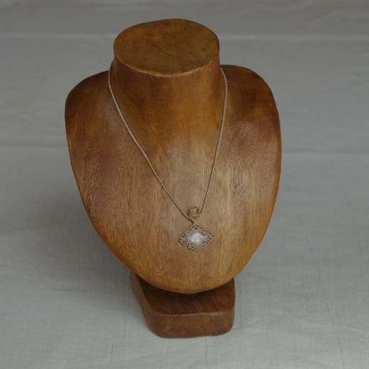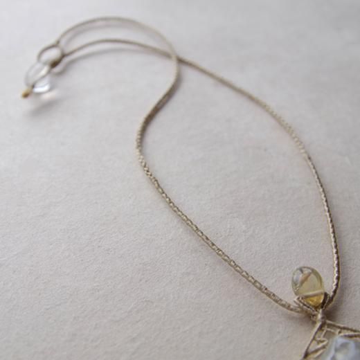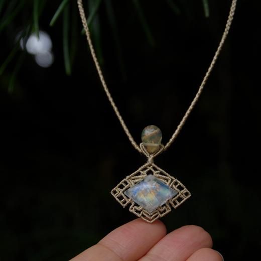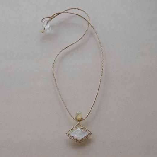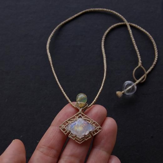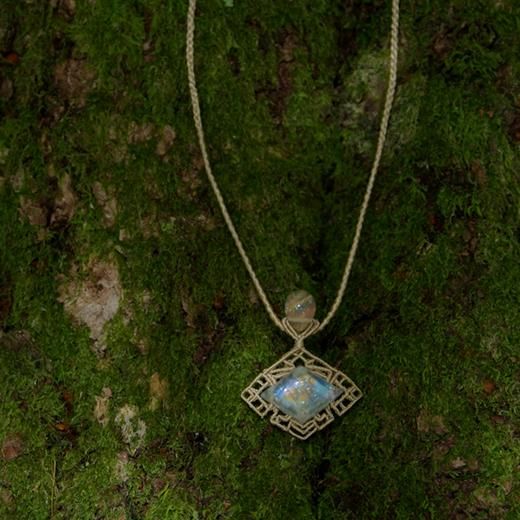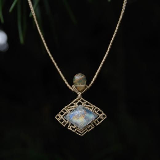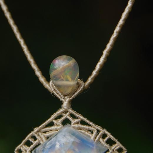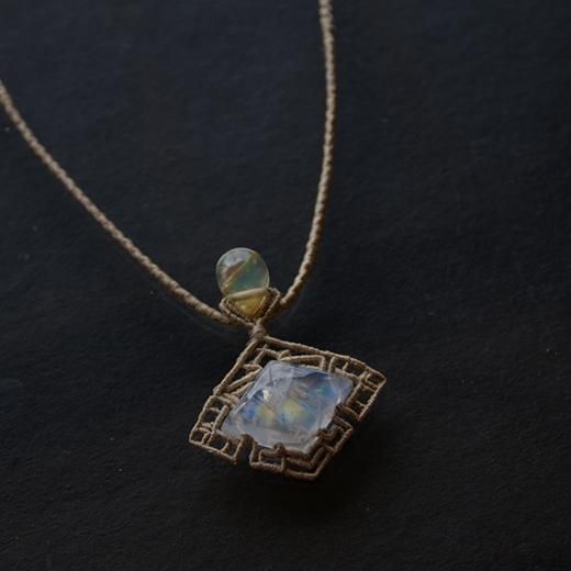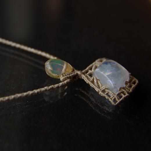 異なる色調を放つエチオピアオパールを合わせ、幾何学的な広がりを糸で描いたネックレスです。