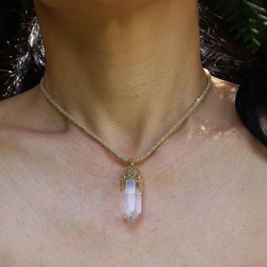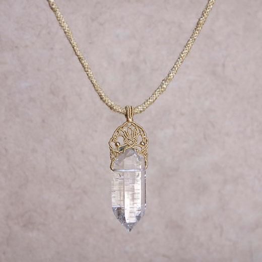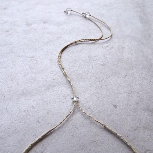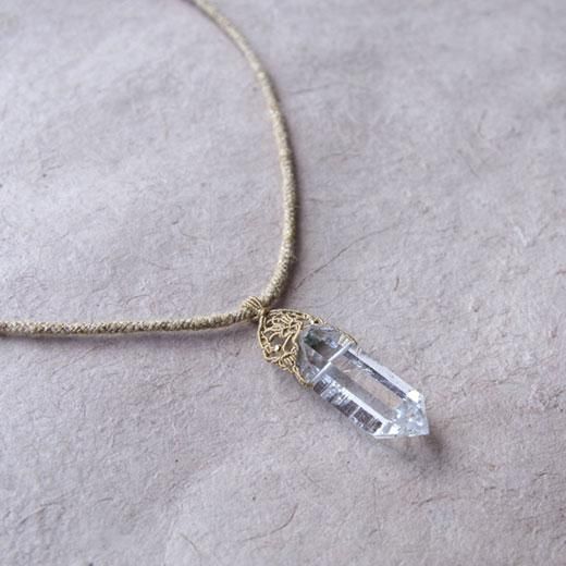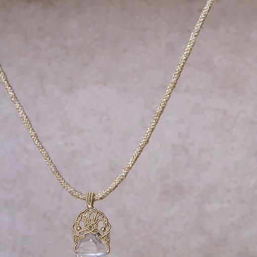 ヒマラヤの水晶の結晶を、趣の異なる2種のムガ蚕糸で編んだネックレス。