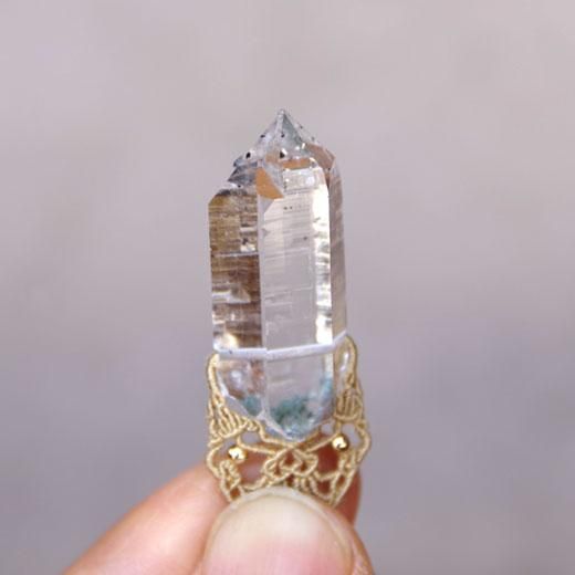 背中を飾るビーズには、結晶から手磨きしたヒマラヤ水晶珠を。