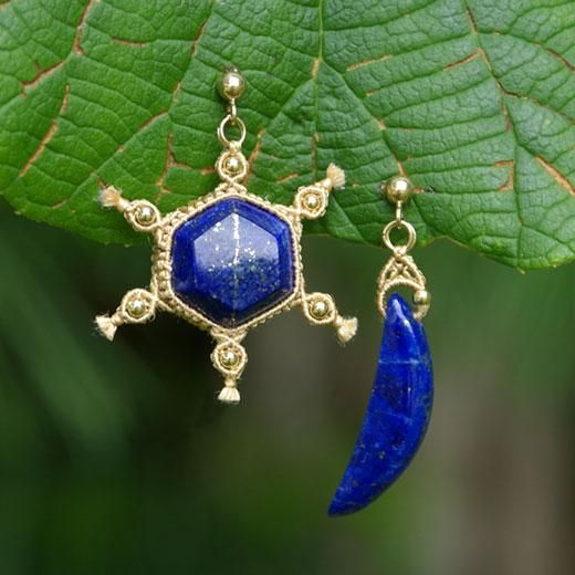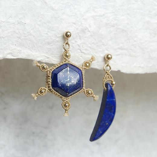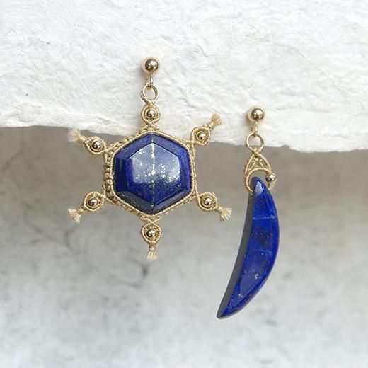 パイライトの金のラインが印象的な六角形と、伸びやかな三日月のラピスラズリのピアス。