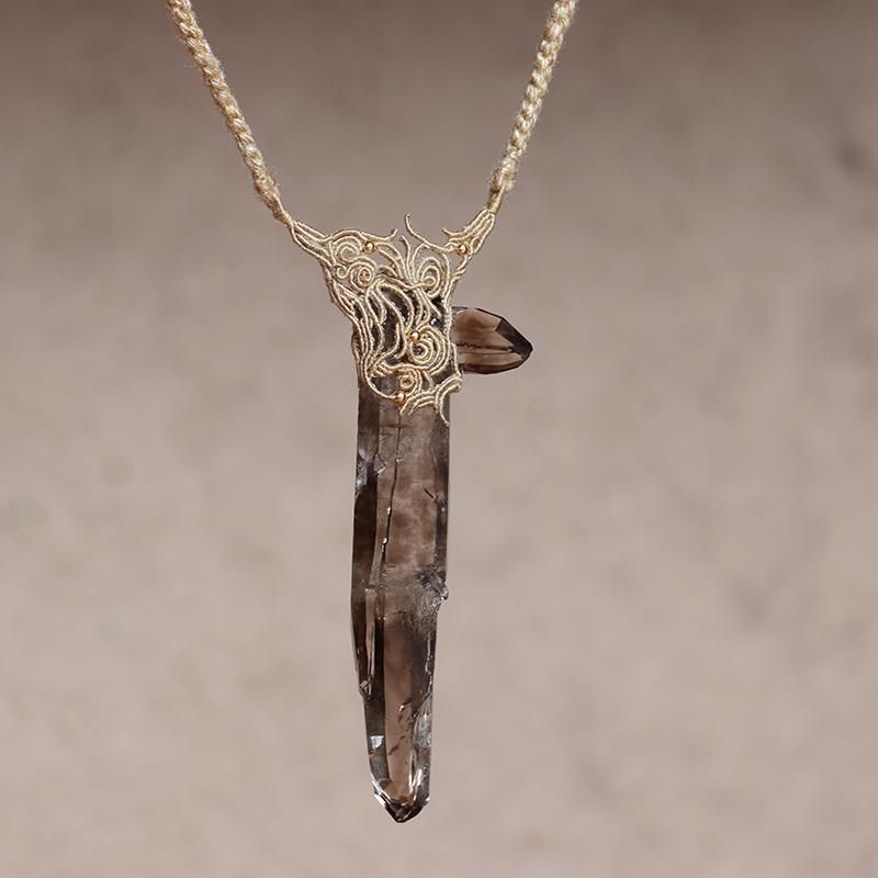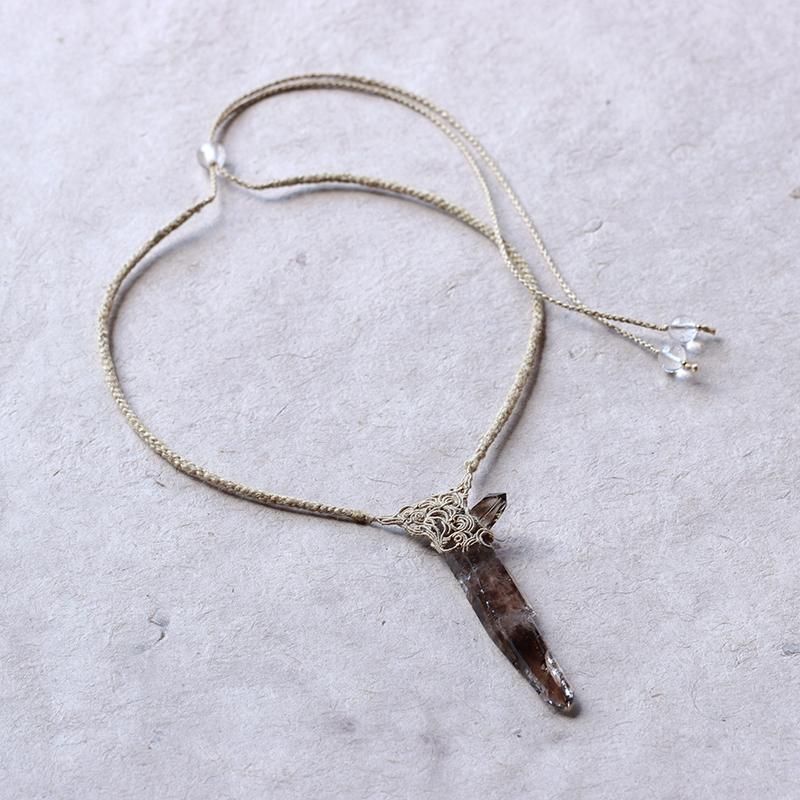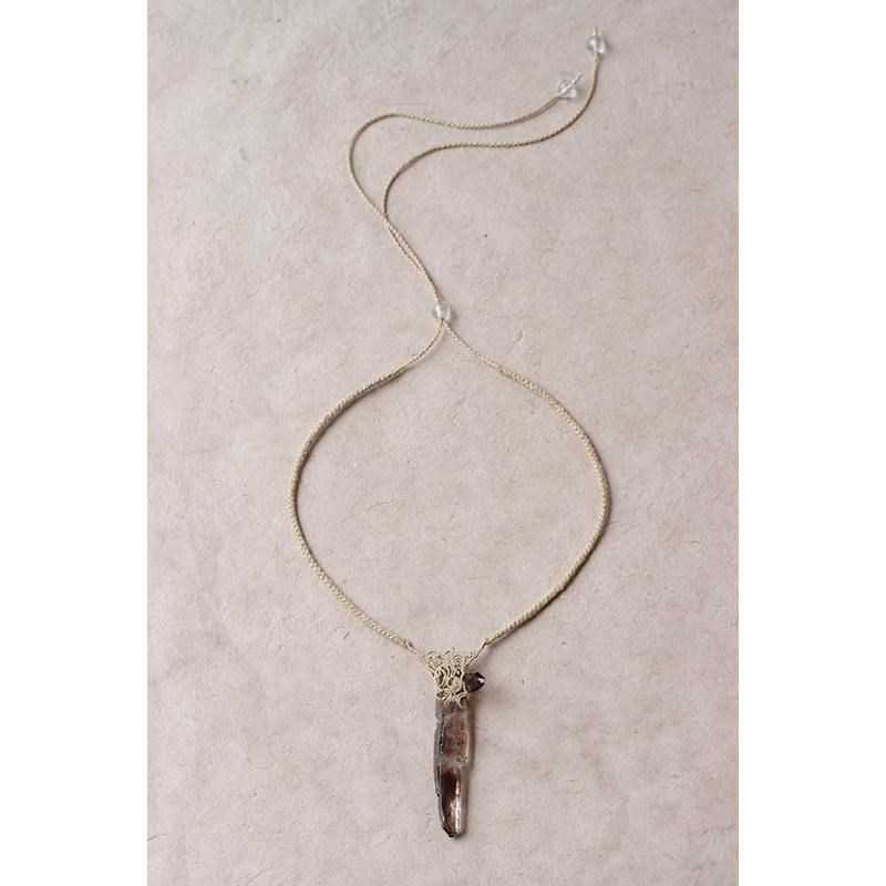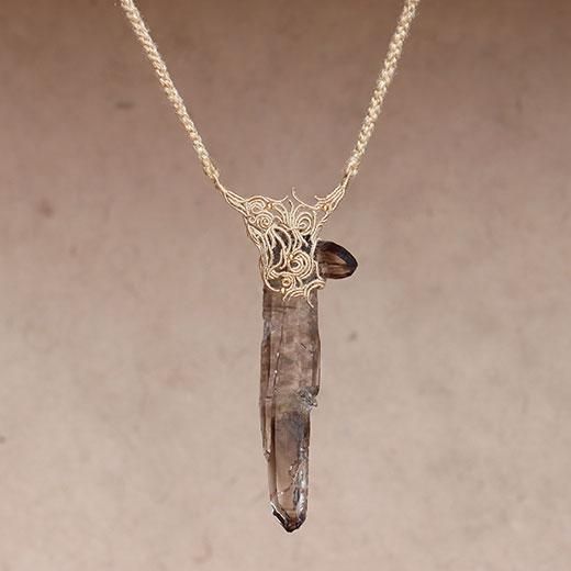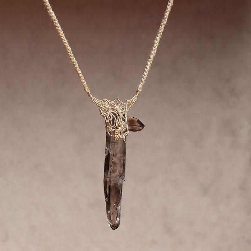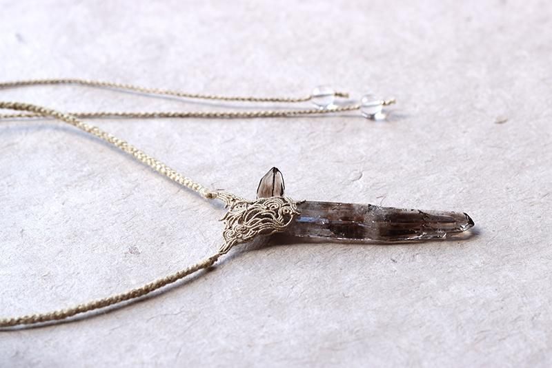 発光しているかのようなスモーキークォーツの結晶を編み込んだネックレス。
