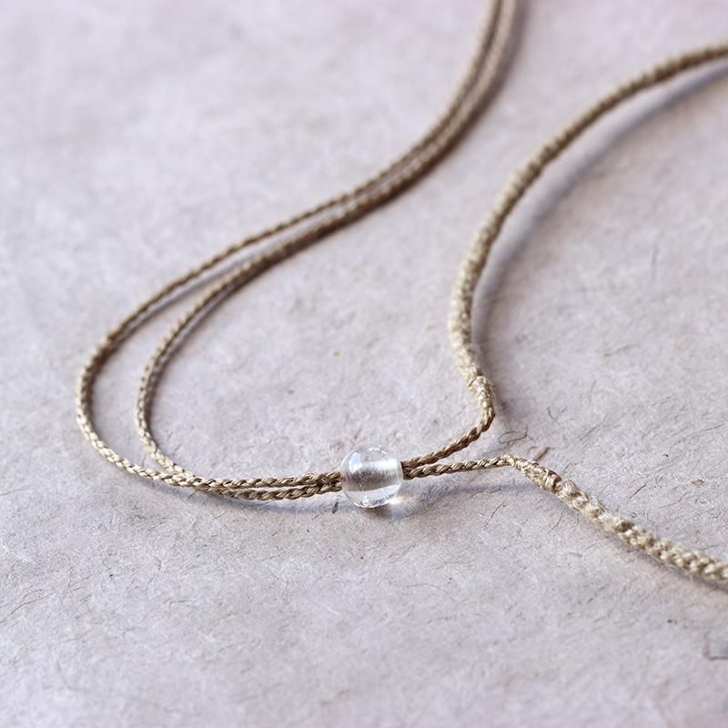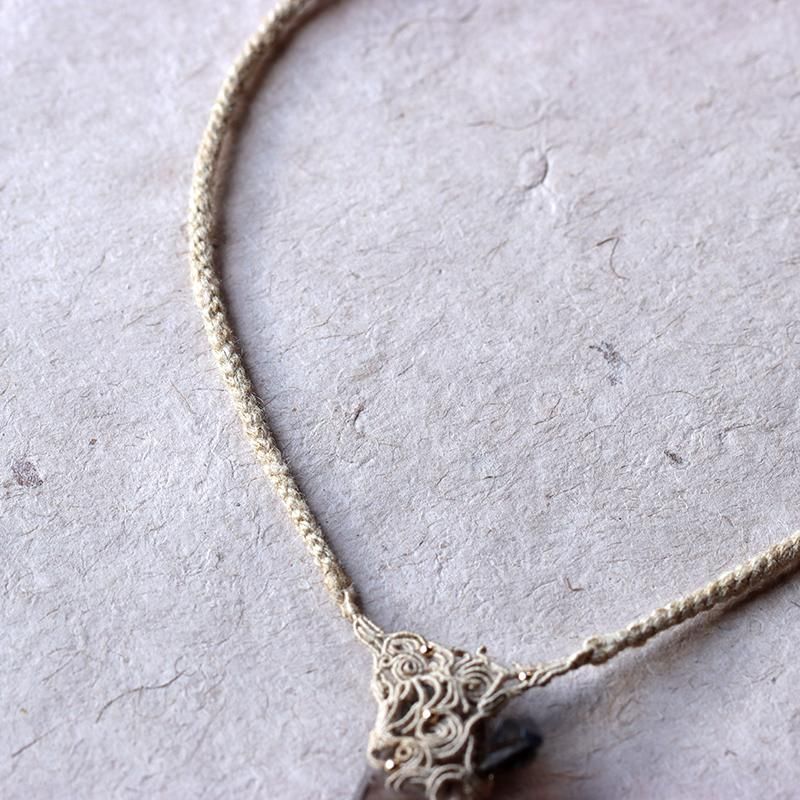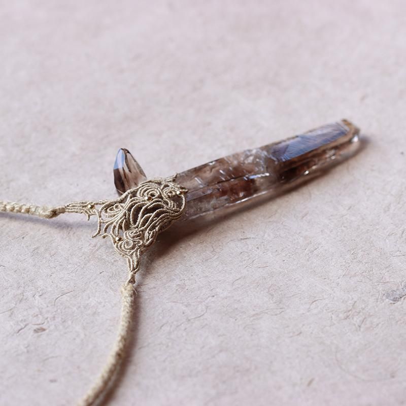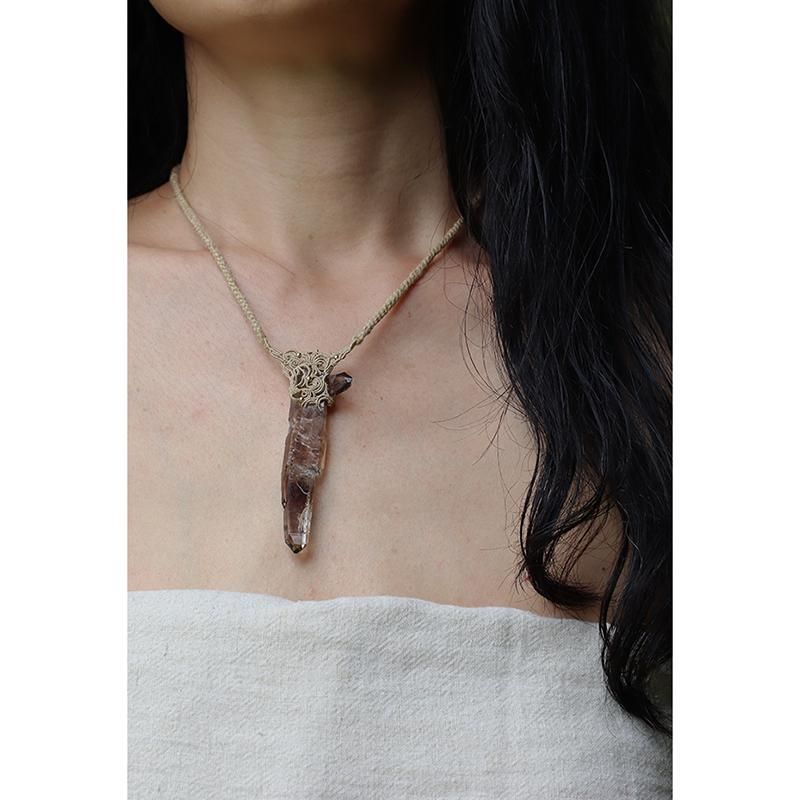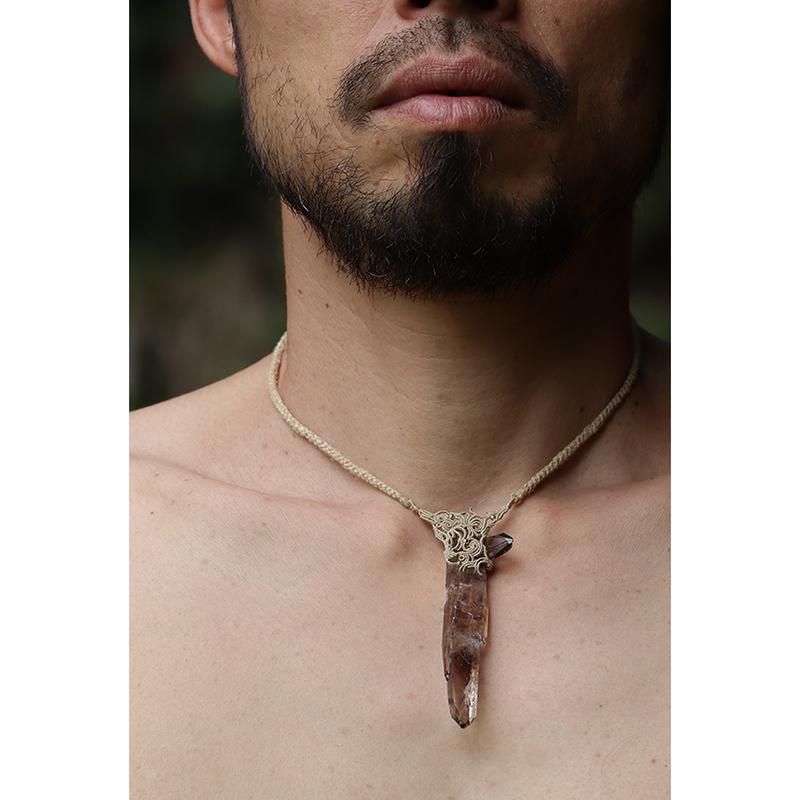発光しているかのようなスモーキークォーツの結晶を編み込んだネックレス。