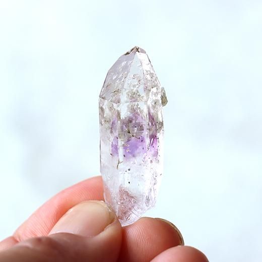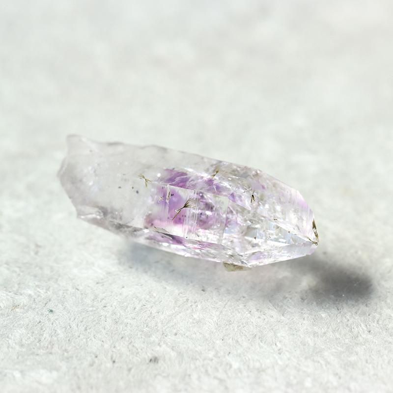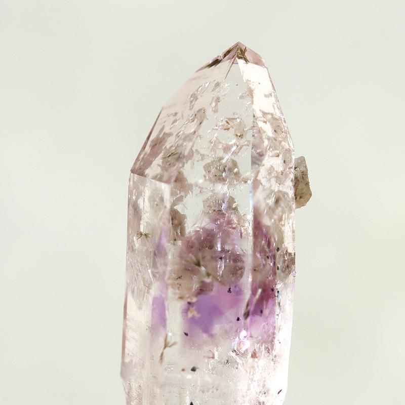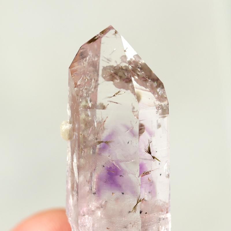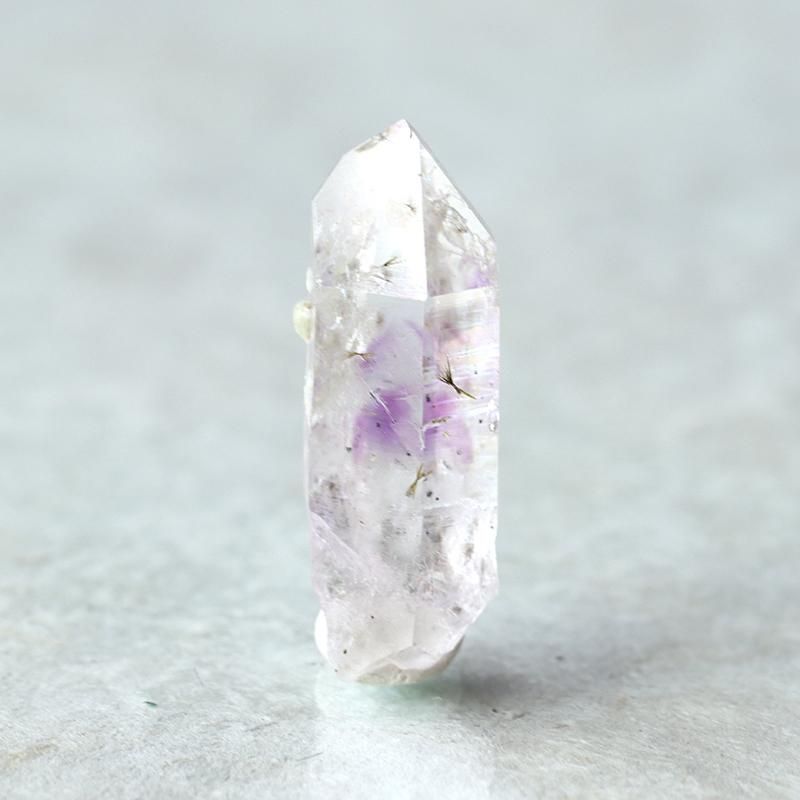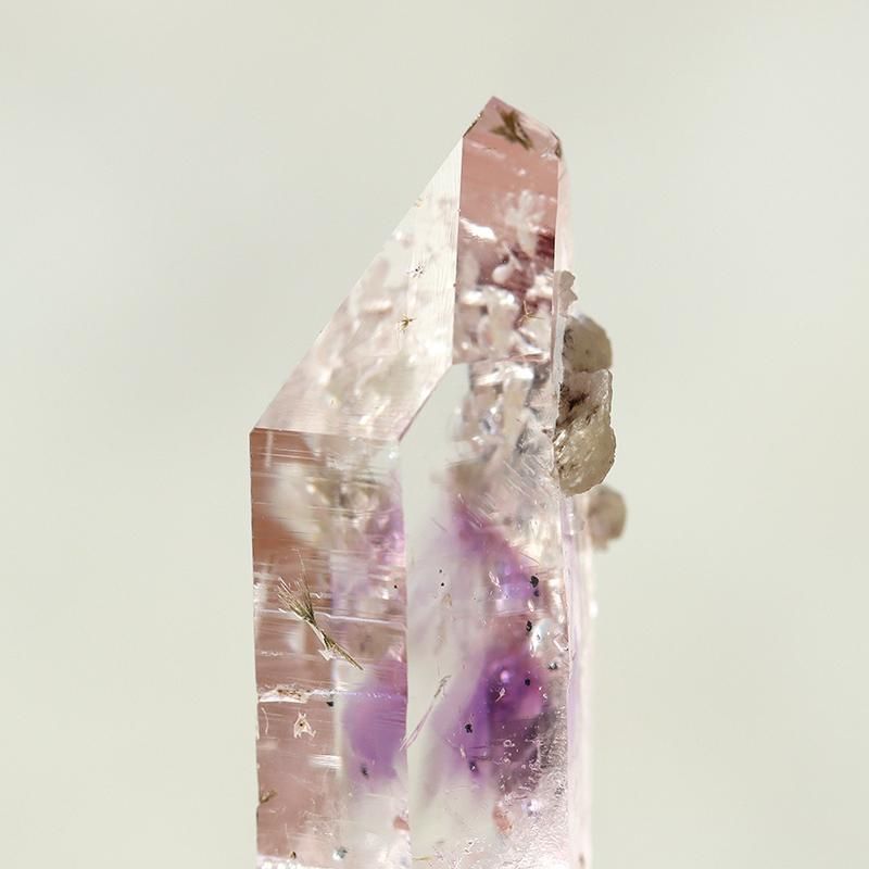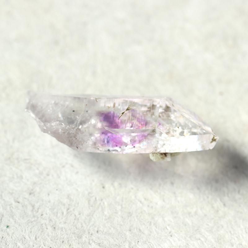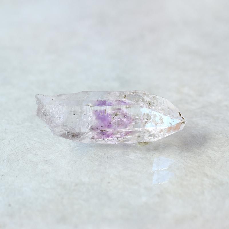 透明度高いクリアクォーツに、鮮やかなアメシストファントムが浮かぶ結晶。