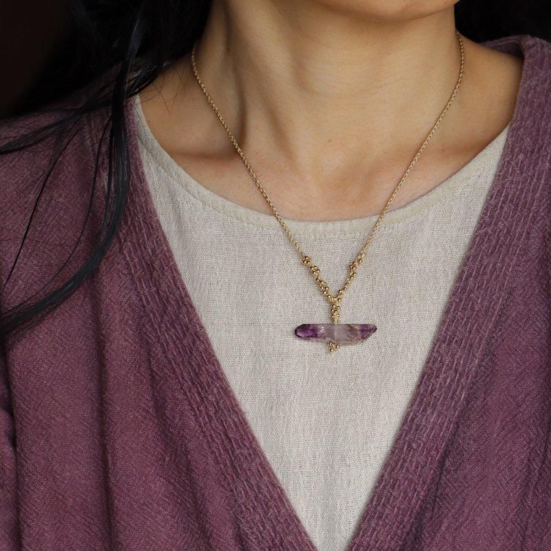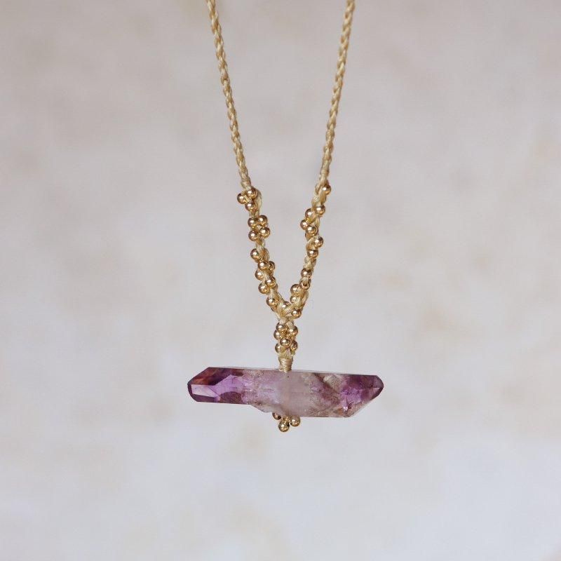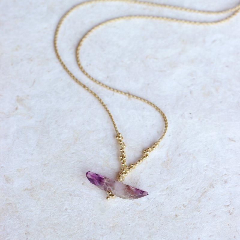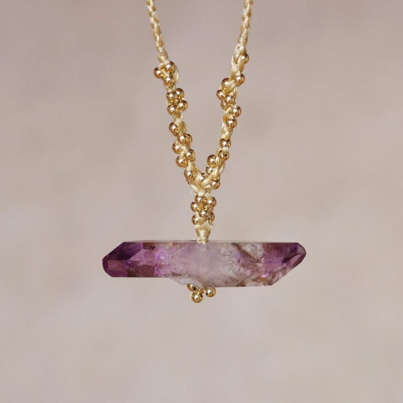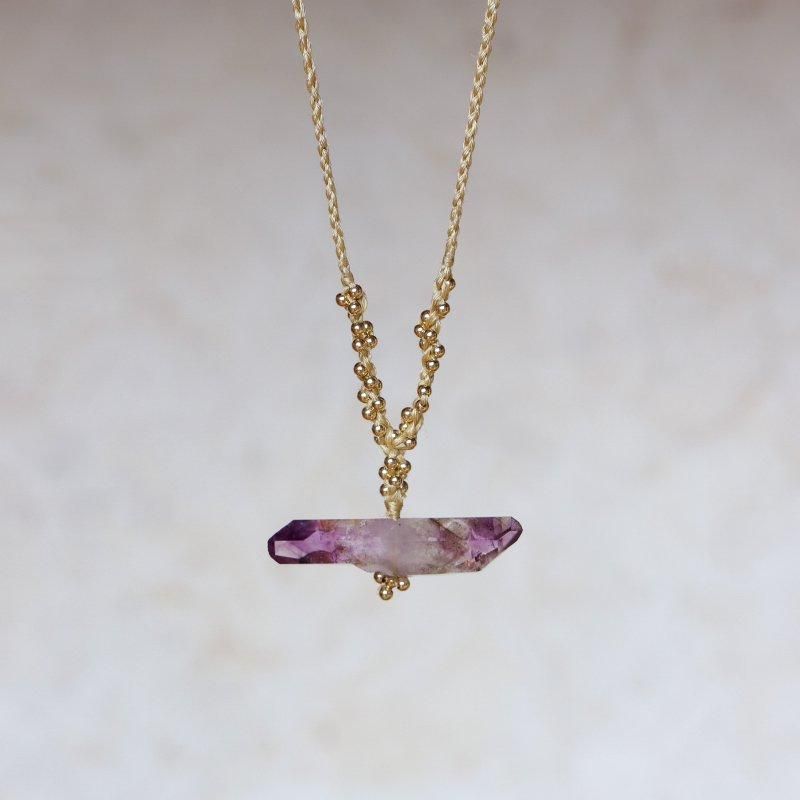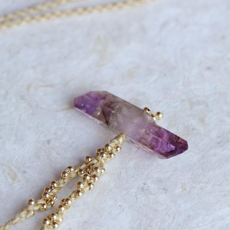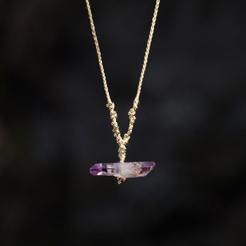 ダブルターミネーション(両錐)のアメシスト結晶をネックレスへと仕立てました。