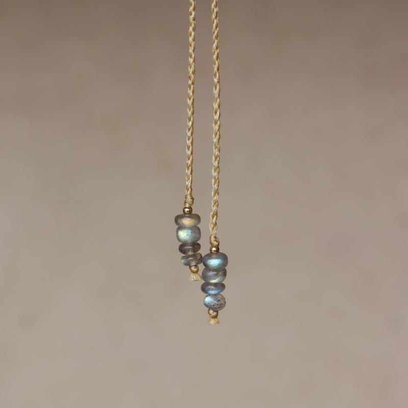 首紐には柔らかな輝きのラブラドライトを入れています。