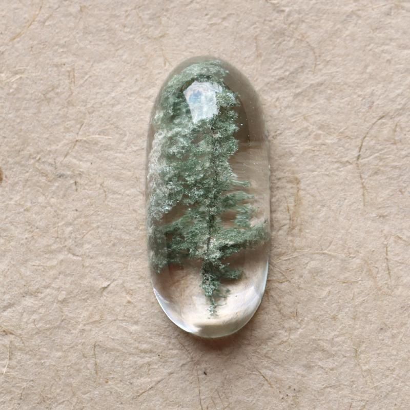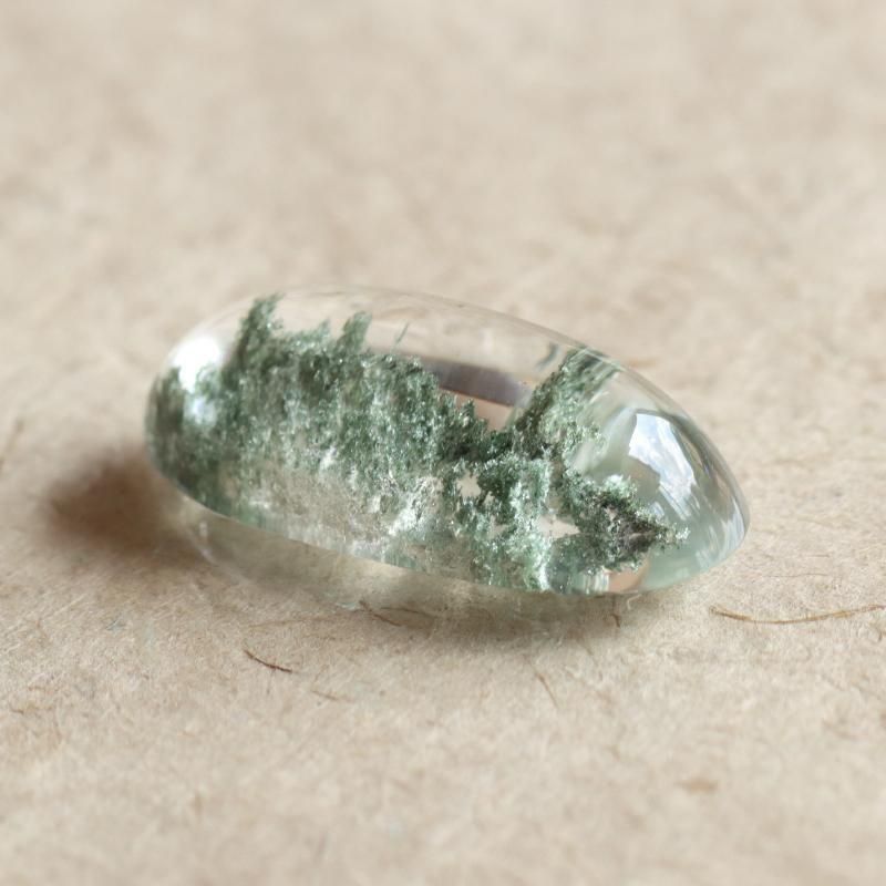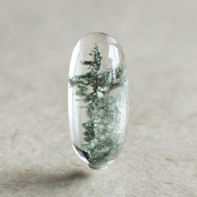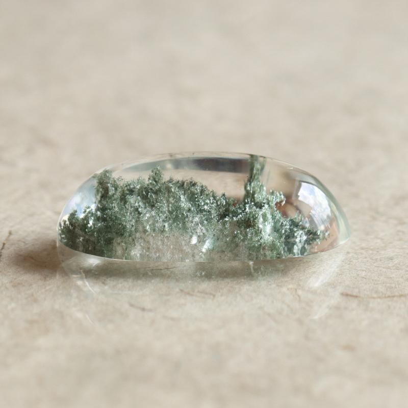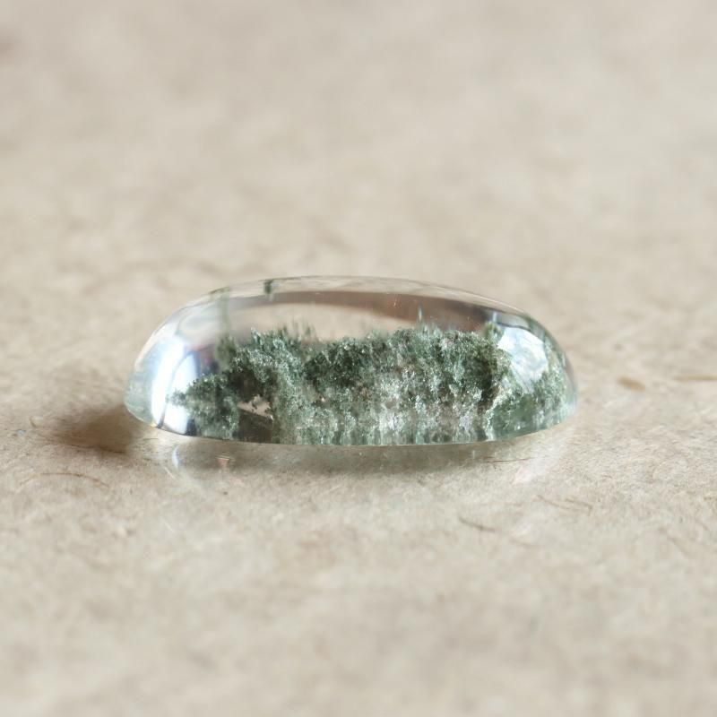粒子状のクローライトの集合体は、光に当たるとフォレストグリーンから軽やかなグリーンへ。