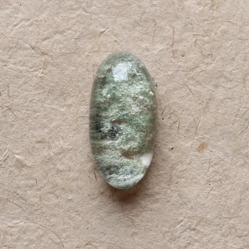 粒子状のクローライトの集合体は、光に当たるとフォレストグリーンから軽やかなグリーンへ。