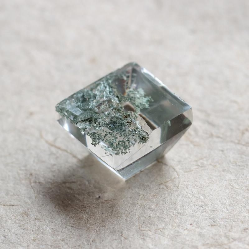 粒子状のクローライトの集合体は、光に当たるとフォレストグリーンから軽やかなグリーンへ。