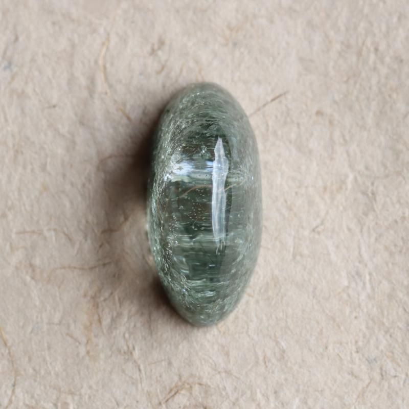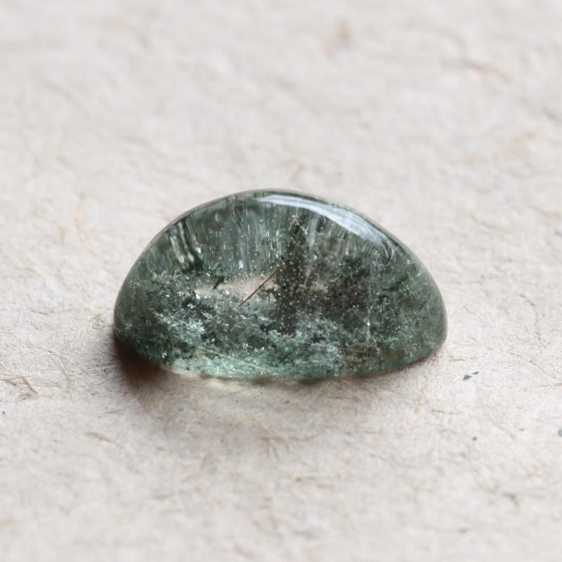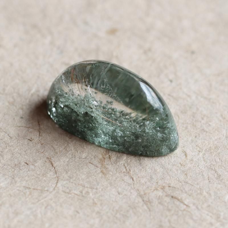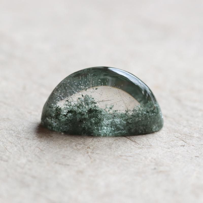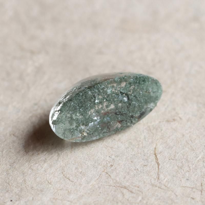 粒子状のクローライトの集合体は、光に当たるとフォレストグリーンから軽やかなグリーンへ。