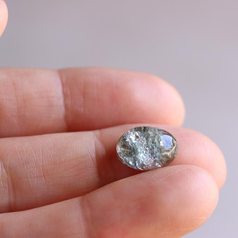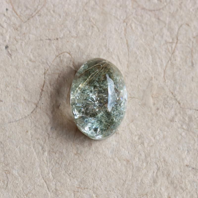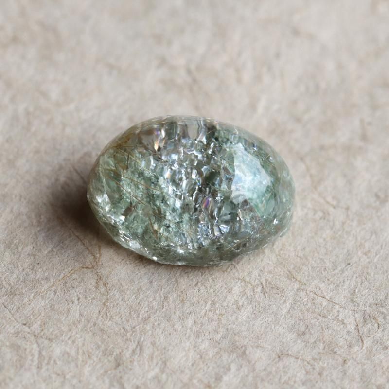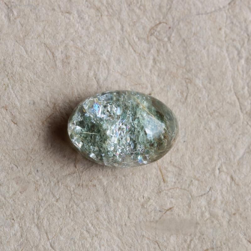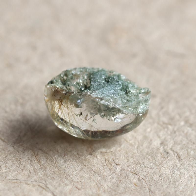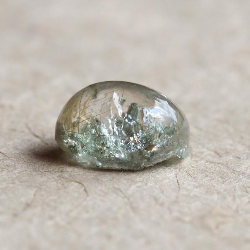 こちらは浅緑色のクローライトと繊細なルチルを内包したピース。