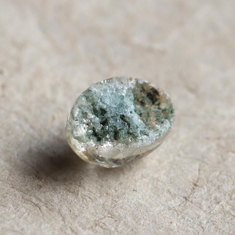 粒子状のクローライトの集合体は、光に当たるとフォレストグリーンから軽やかなグリーンへ。