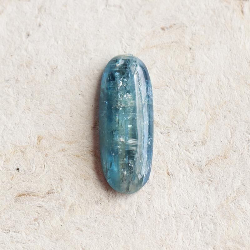 カイヤナイト ------------------------------ サイズ:22mm×8mm×4mm 重さ:8.9ct 産出地:Zimbabwe ------------------------------ 結晶からまほらで研磨して仕上げたカイヤナイトのルース。 ジンバブエ産らしい奥行きあるティールブルーのカイヤナイトです。