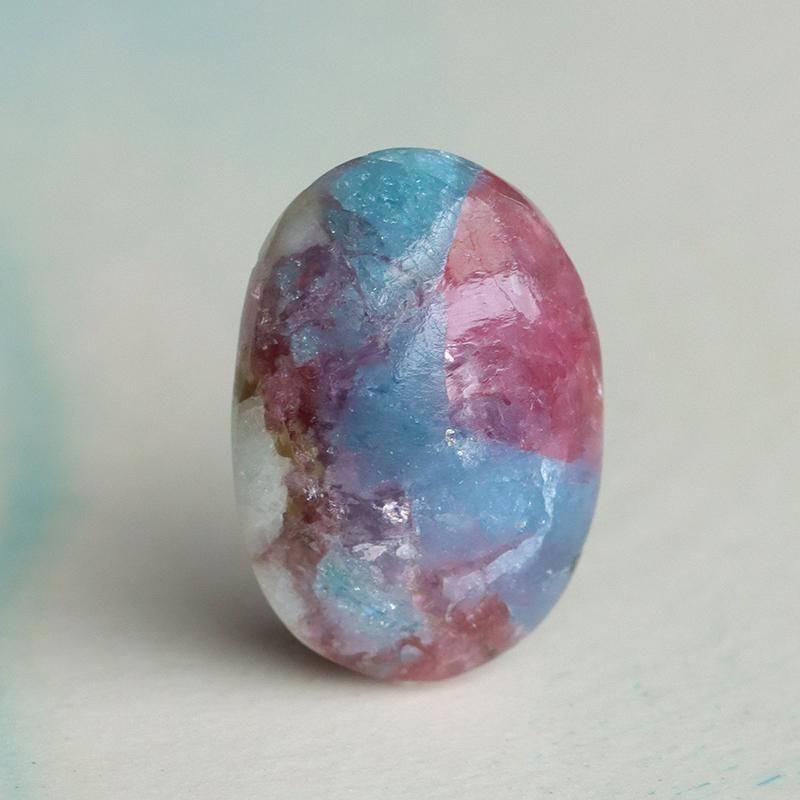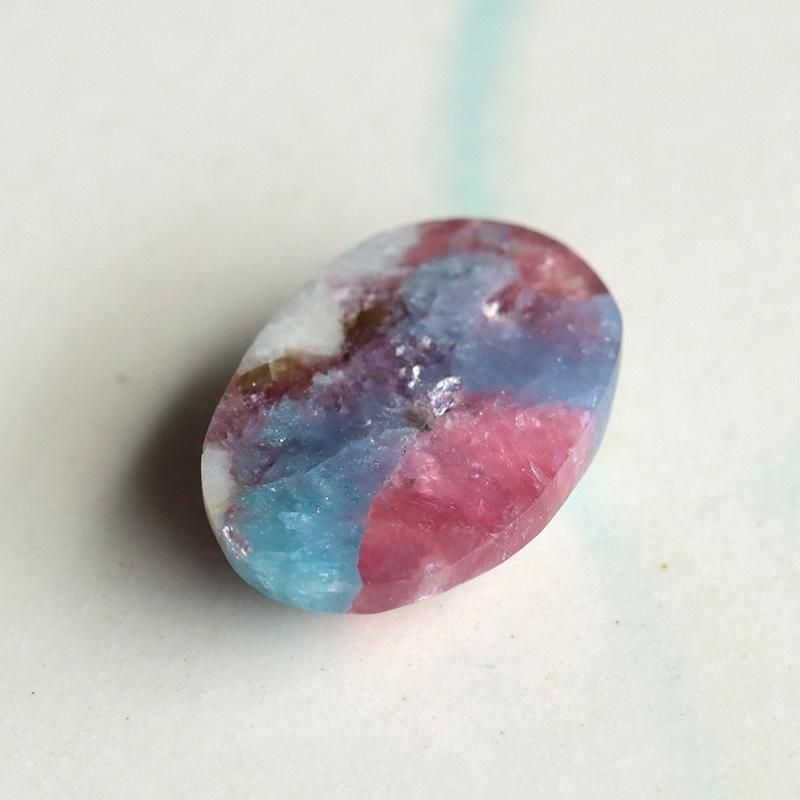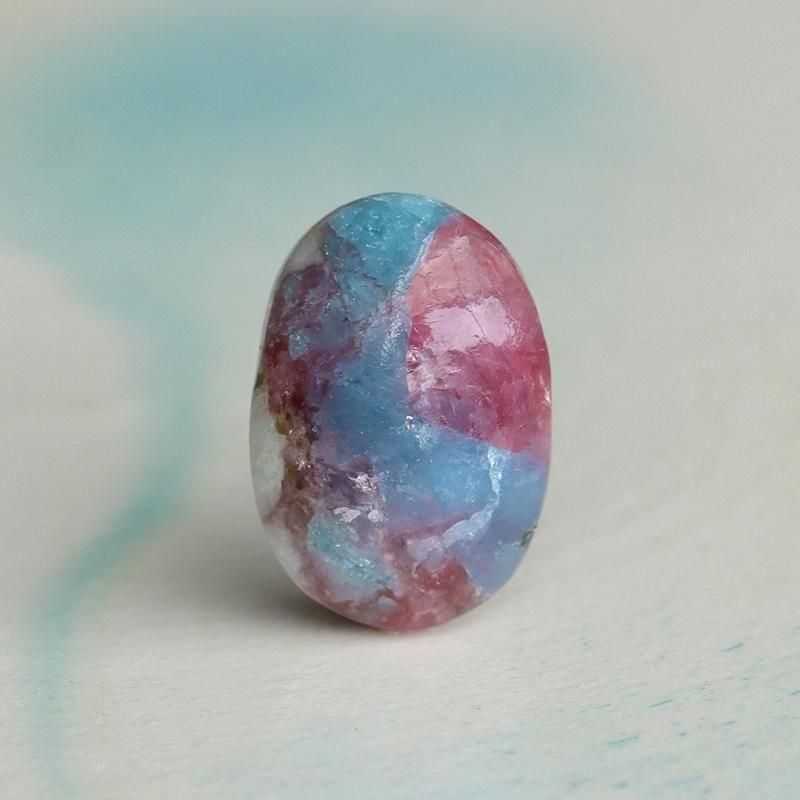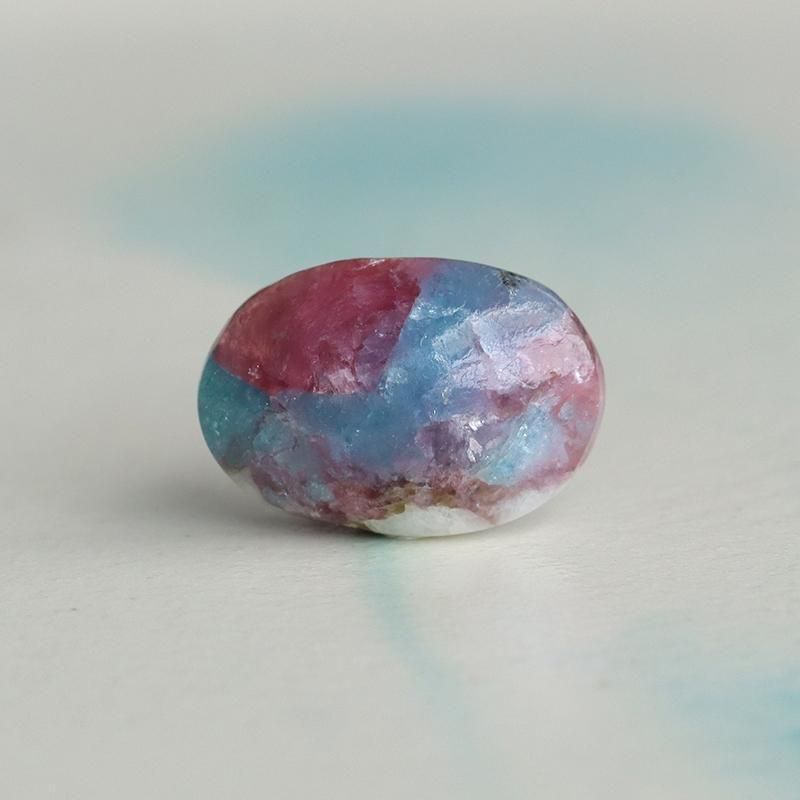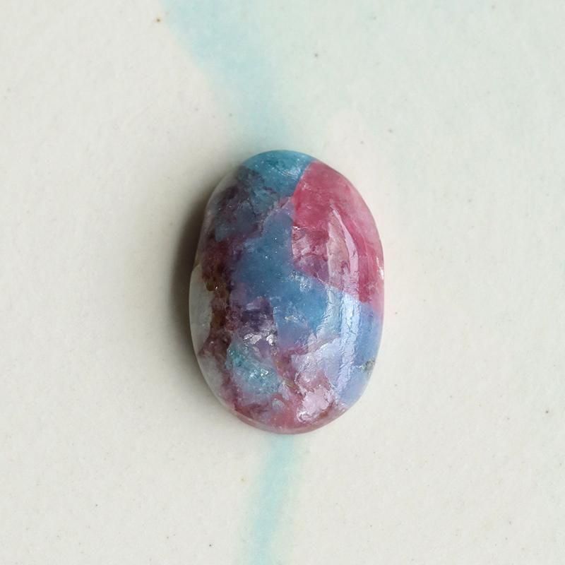 パライバトルマリンインクォーツ ------------------------------ サイズ:18mm×12mm×5mm 重さ:9.7ct 産出地:Brazil ------------------------------ 原石からまほらで研磨したパライバトルマリンインクォーツ。 含浸処理などされていないため、無垢な質感が残っています。 共生しているワインレッドの鉱物はレピドライト。 新しい感覚が啓かれるような、対称的な色同士で成された石です。