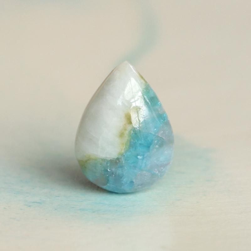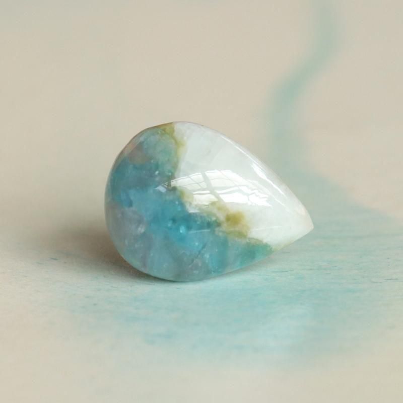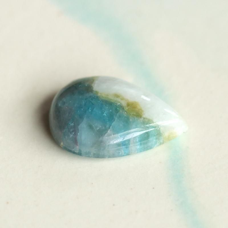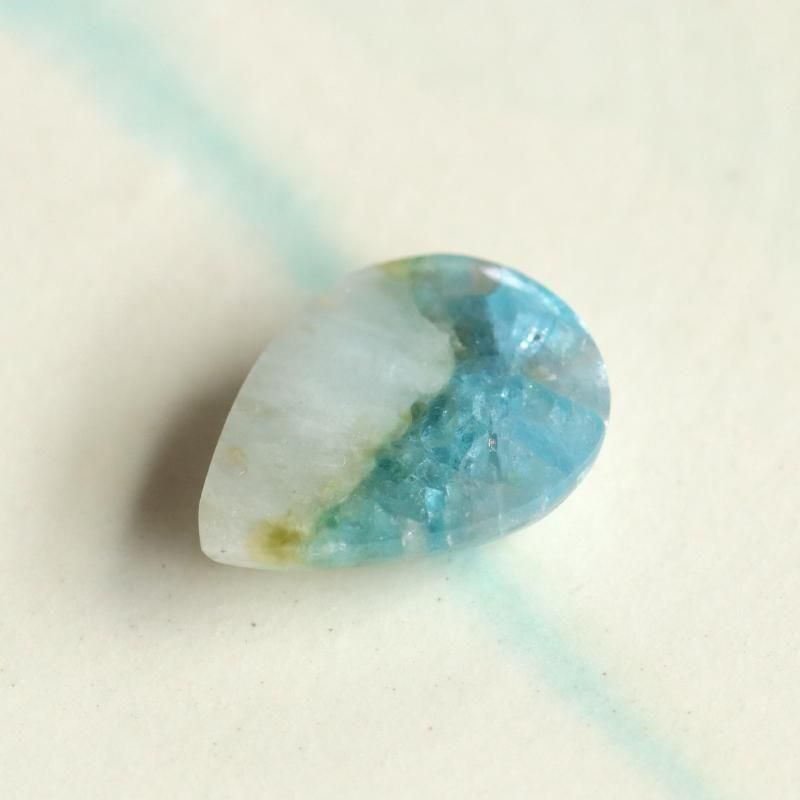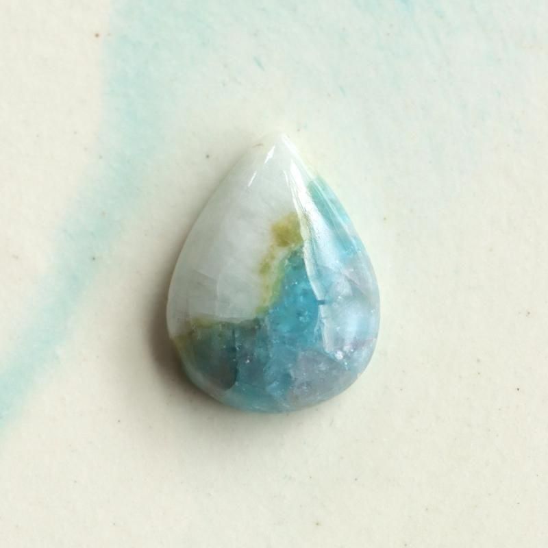 パライバトルマリンインクォーツ ------------------------------ サイズ:18mm×13mm×5mm 重さ:8.9ct 産出地:Brazil ------------------------------ ブルー×ホワイトのパライバトルマリンインクォーツ。 ツーソンショーでセレクトしたカボションです。