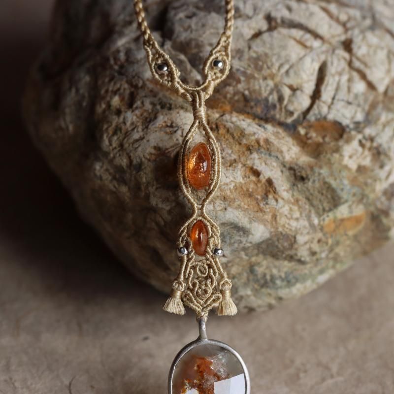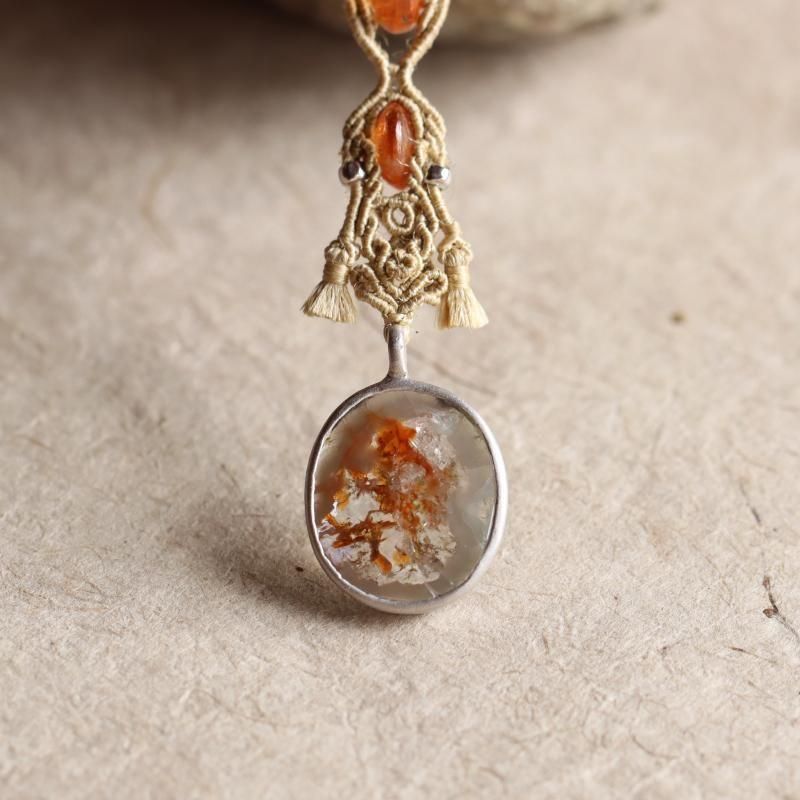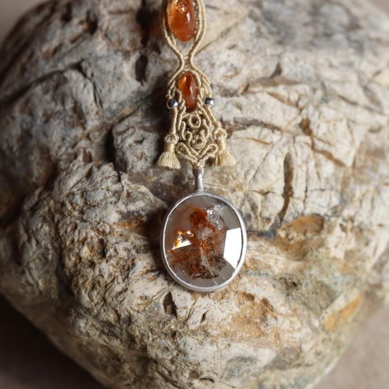 煌々と輝く赤色のインクルージョンにインスピレーションを受けて、サンストーンを合わせて編んだ作品。